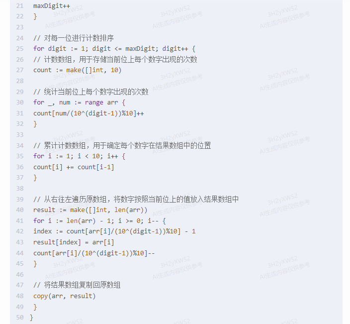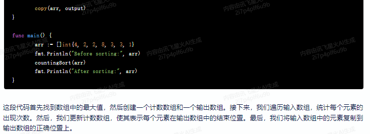 }这段代码首先找到数组中的最大值,然后创建一个计数数组和一个输出数组。接下来,我们遍历输入数组,统计每个元素的出现次数。然后,我们更新计数数组,使其表示每个元素在输出数组中的结束位置。最后,我们将输入数组中的元素复制到输出数组的正确位置上。