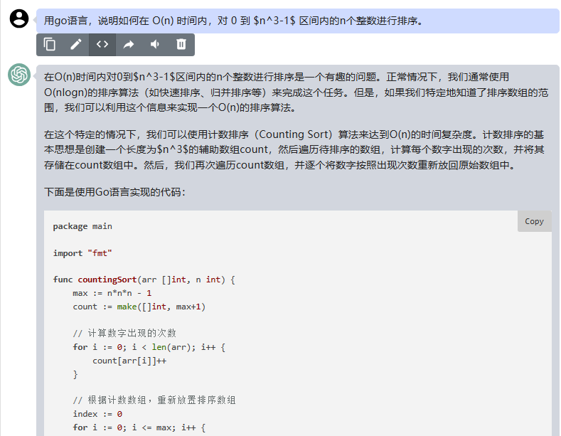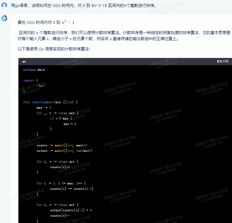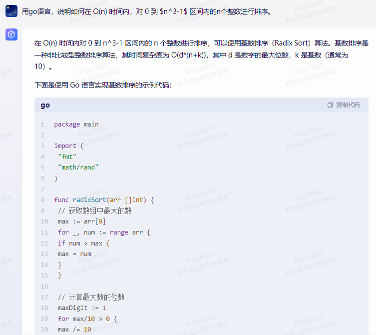 需要注意的是,这个实现假设输入的整数切片中的元素是已知的,并且需要在 O(n) 时间内进行排序。如果需要在运行时动态生成整数切片并进行排序,那么可能需要考虑使用其他数据结构和算法来优化时间复杂度。