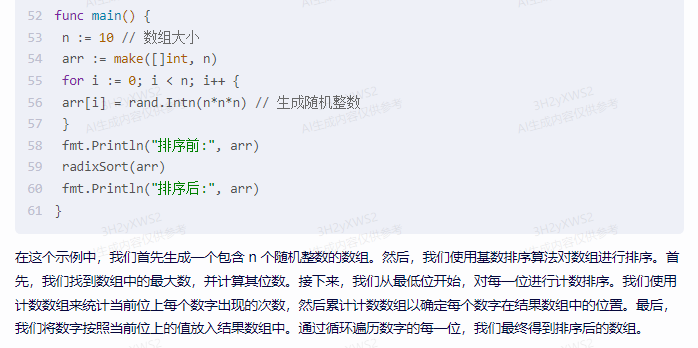 }在这个示例中,我们首先生成一个包含 n 个随机整数的数组。然后,我们使用基数排序算法对数组进行排序。首先,我们找到数组中的最大数,并计算其位数。接下来,我们从最低位开始,对每一位进行计数排序。我们使用计数数组来统计当前位上每个数字出现的次数,然后累计计数数组以确定每个数字在结果数组中的位置。最后,我们将数字按照当前位上的值放入结果数组中。通过循环遍历数字的每一位,我们最终得到排序后的数组。