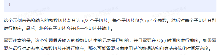 }这个示例首先将输入的整数切片划分为 n/2 个子切片,每个子切片包含 n/2 个整数。然后对每个子切片分别进行排序。最后,将所有子切片合并成一个切片并输出。