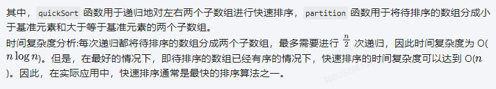 }其中,quickSort 函数用于递归地对左右两个子数组进行快速排序,partition 函数用于将待排序的数组分成小于基准元素和大于等于基准元素的两个子数组。