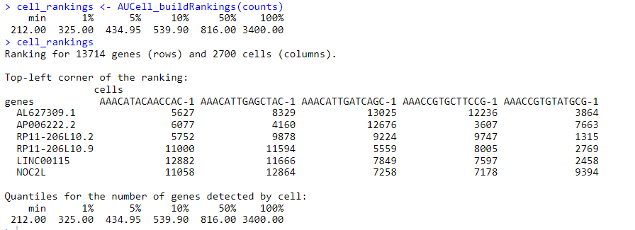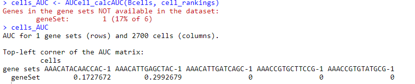 cells_AUC <- AUCell_calcAUC(Bcells, cell_rankings)