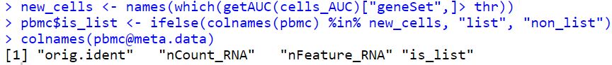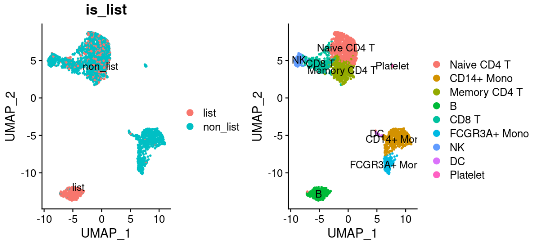 pbmc$is_list <- ifelse(colnames(pbmc) %in% new_cells, "list", "non_list")