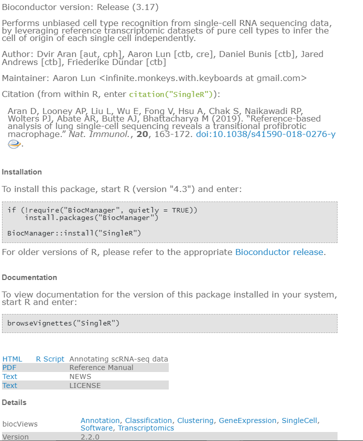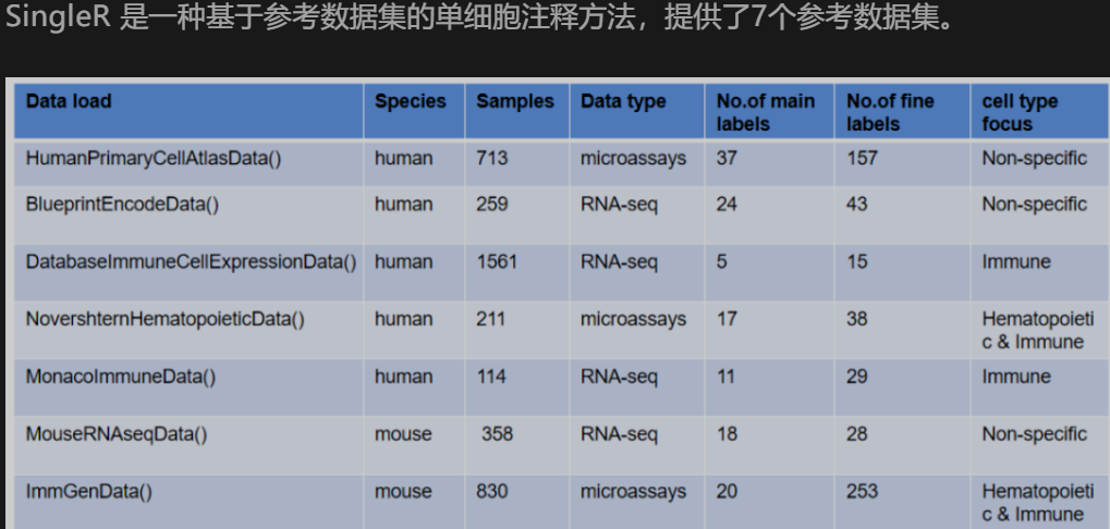SingleR的另一个优势是也可以自定义一个参考数据集,因为参考数据集的质量或者参考数据集的适用性也是影响注释好坏的一个因素。如果能够找到更好的参考数据集可以自定义,运用SingleR软件进行注释。