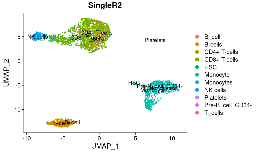 DimPlot(pbmc, group.by = "SingleR2", reduction = "umap", label = TRUE)