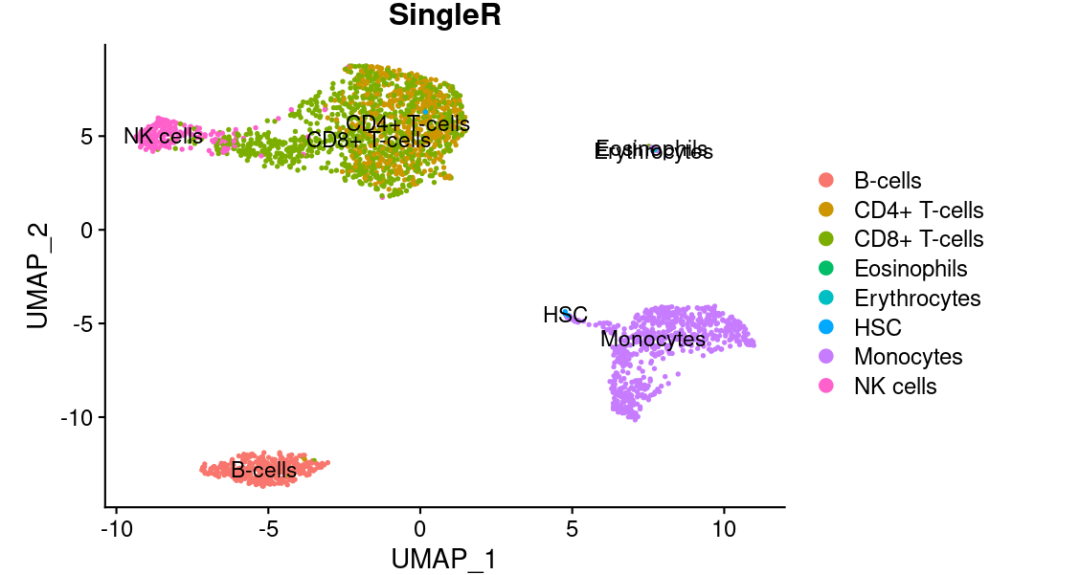 DimPlot(pbmc, group.by = "SingleR", reduction = "umap", label = TRUE)
