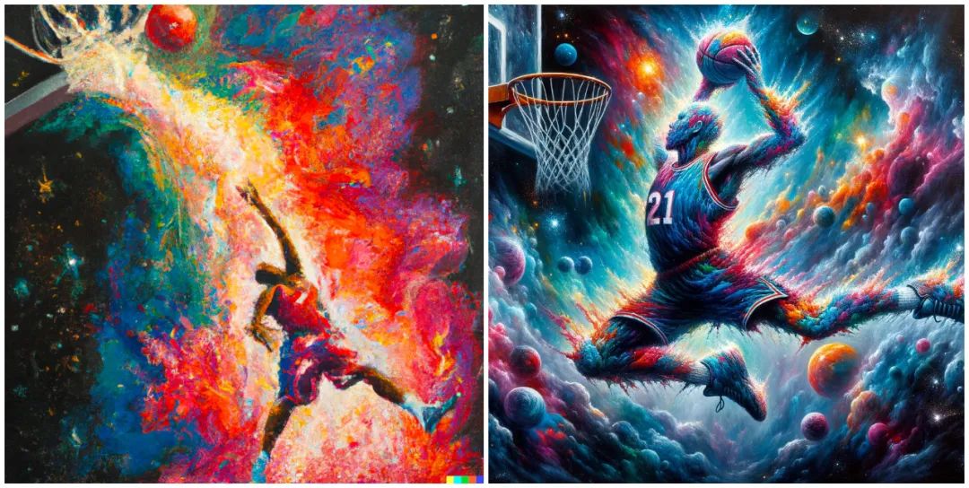 是不是真如 OpenAI 所说的那样呢?眼见为实,我们来看以下 DALL・E 3 与 DALL・E 2 的生成效果比较,同样的 prompt「一幅描绘篮球运动员扣篮的油画,并伴以爆炸的星云」,左图 DALL・E 2 在细节、清晰度、明亮度等方面显然逊于右图 DALL・E 3。