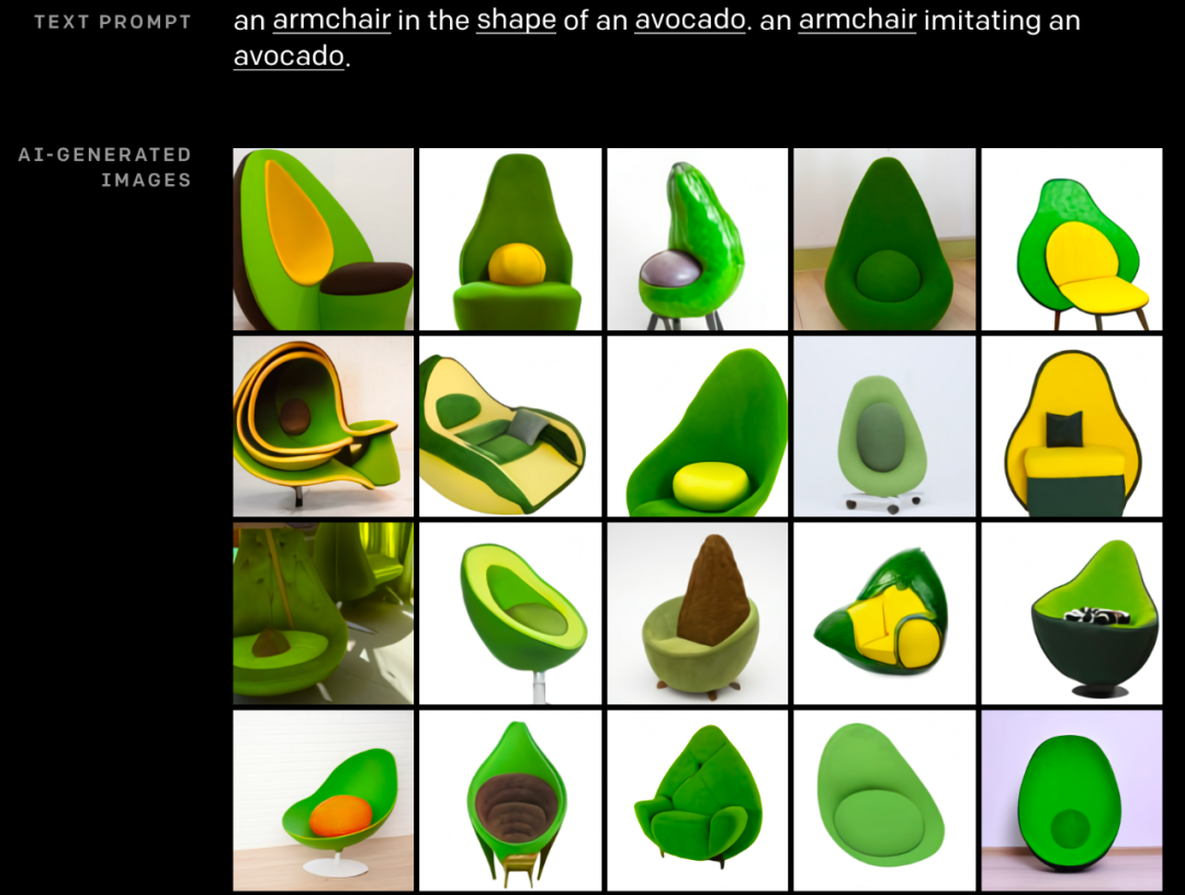 DALL・E 示例。给出一句话「牛油果形状的椅子」,就可以获得绿油油、形态各异的牛油果椅子图像。