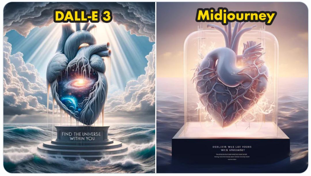 可以看到在上图将 prompt 中的每一个细节都表现出来了。半透明的质感、画面底部的波涛汹涌、阳光与厚厚的云层、心脏中的宇宙景象,以及难倒很多图像生成模型的文字展现,DALL・E 3 都顺利地完成了这些任务。