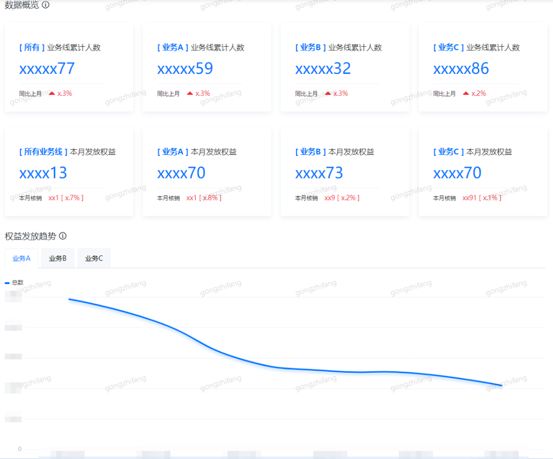 目前针对运营可能的数据诉求,打造了一版简易的数据看板,包括业务线的人数概览、本月发放权益数量、权益每日变化趋势。