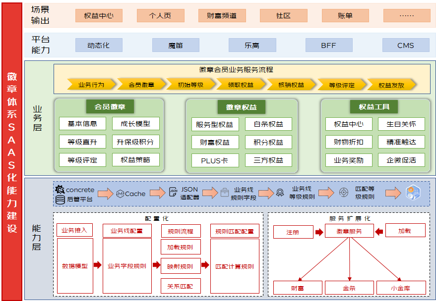底层依赖于量化系统进行等级分值的计算评定,依赖于中台系统进行相关权益的发放,通过下图,可以对徽章体系有整体的认识。