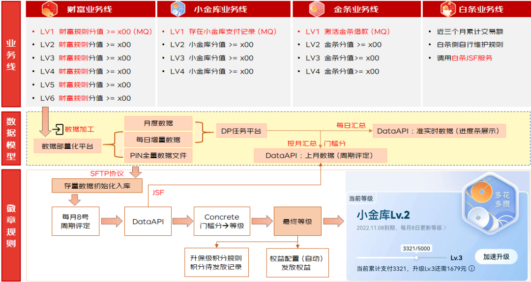 {"user_pin":"xxx","lc_score":"450","gdlc_jy_flag":"0","xjk_jy_amt":"1600.00","jt_hold_amt":"3000.00","dt":"2022-11-30}d、徽章侧每月8日,发起周期等级评定的任务,加载本地全量PIN数据,调用DataAPI服务,获取业务线的分值并与本地等级规则进行匹配,计算最终等级。