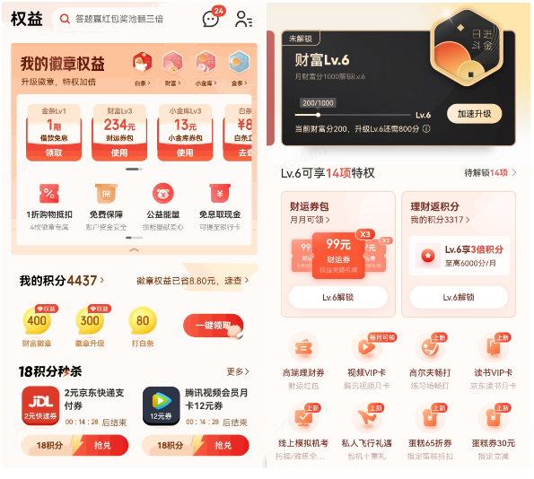 页面上方为徽章列表及权益聚合展示,下方为积分气泡聚合领取楼层,包含:白条返积分、徽章升保级积分和财富积分等。