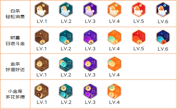 新版徽章系统,从业务视角进行等级划分,使会员等级拥有了业务属性,如下图所示,目前接入了四个业务线的徽章:白条、财富、金条和小金库。