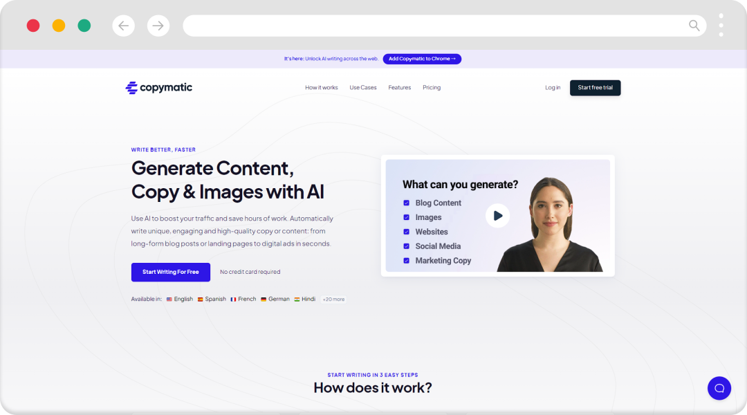Copymatic.ai 是一款AI写作助手和内容撰写工具。它具有强大的功能,可帮助您编写与品牌声音相匹配的内容。无论是编写博客文章、社交媒体内容还是网站文案,Copymatic.ai 都能为您提供高质量的内容创作解决方案。