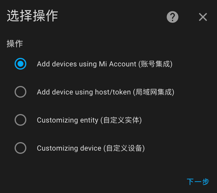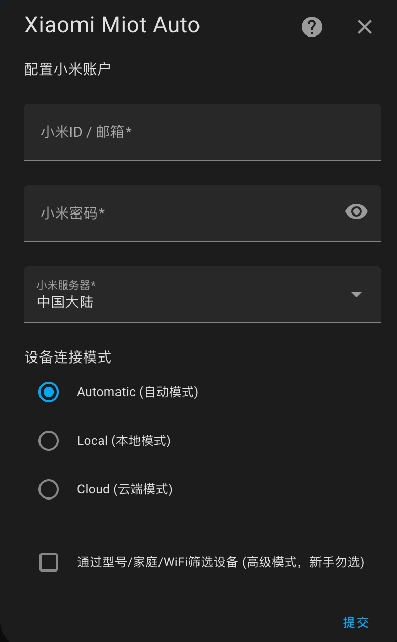 【集成】中搜索【Xiaomi Miot Auto】,添加条目,使用默认的账号集成