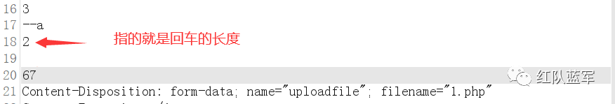 这里上面讲到了分块传输,这里直接先使用分块传输来进行绕过。这里讲下计算方式,因为文件上传不像sql注入那样单行,所以文件上传是会有回车和空格的计算,(一个回车和一个空格占两个字符)。例如下图: