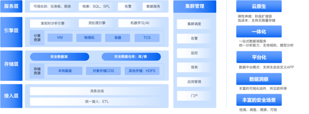 腾讯云原生安全数据湖是基于云原生的自研数据分析平台,利用日志数据无需修改、大量字段重复、有时间戳等特性进行了几大创新: