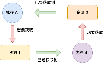 比如,线程 A 已经持有资源 2,而想请求资源 1, 线程 B 已经获取了资源 1,而想请求资源 2,这就形成资源请求等待的环形图。