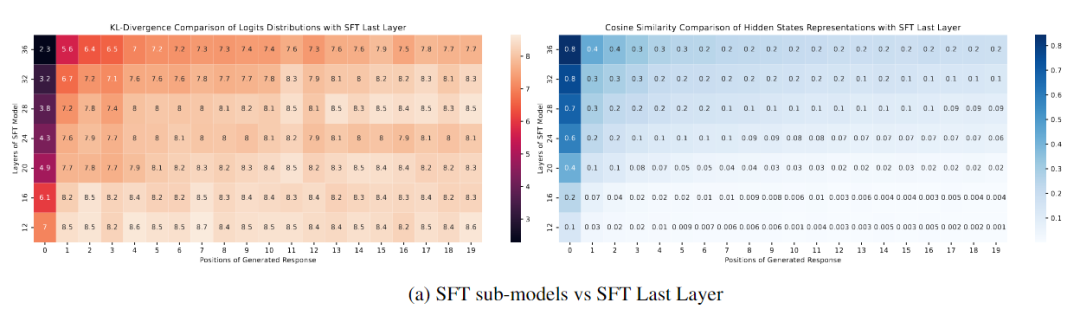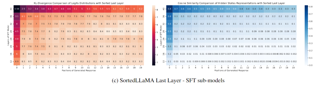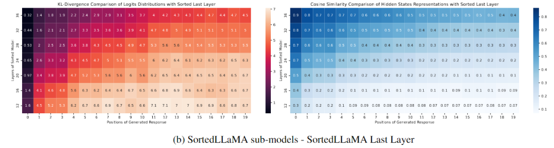 下图(a)比较了Sorted LLaMA和SFT子模型在不同输出位置上的概率分布。首先,图(a)左展示了与SFT模型的最后一层以及从第12层到第36层的层次之间的比较。可以明显看出,与生成初始标记后的最后一层相比,即使在较高的层次,如36和32,输出分布迅速发散。需要注意的是,这种评估是在zero-shot方式下生成的,没有调整分类器头。