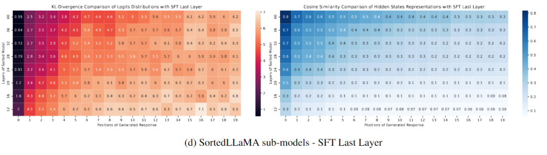 图(d)比较了所有排序层次的输出分布与最后一个SFT层次的输出分布。与图4c(左)相比,图4d(左)显示Sorted LLaMA甚至在较低层次的初始输出标记上也能保持与SFT完整尺寸模型接近的输出分布。