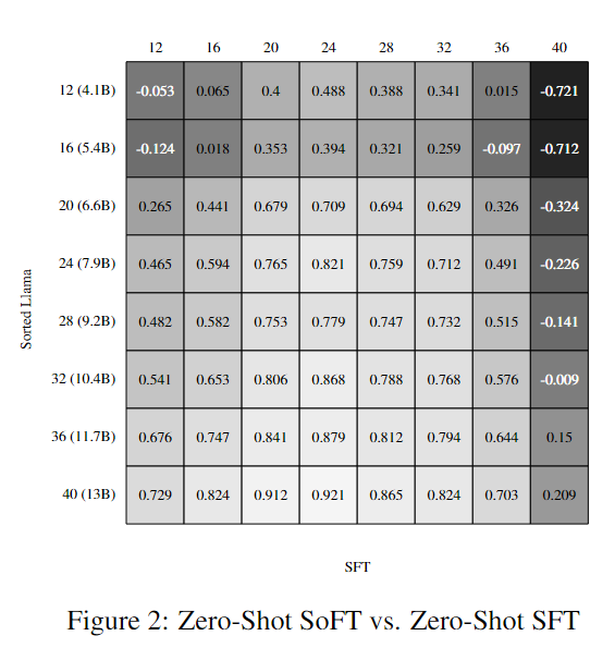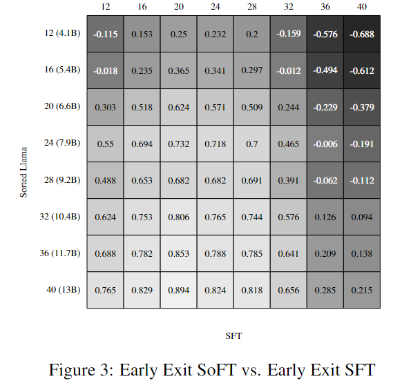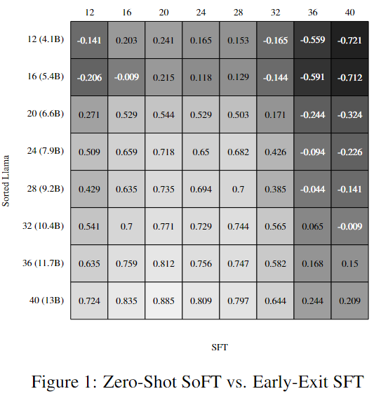 为了证明这种方法的有效性,研究人员使用了LLaMa 2 13B和Stanford Alpaca数据集进行测试和验证。他们不仅对比了SFT和SoFT这两种方法,还创建了多个不同层次的子模型来确定哪些层最能产出高质量的结果。测试结果令人鼓舞——使用SoFT创建的子模型不仅运行速度更快,而且能够保持或甚至超越原始模型的性能水平。