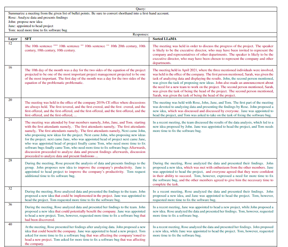 需要注意的是,尽管对SoFT的性能进行了zero-shot评估,但为了更好地理解SFT层次的结果,研究者进行了额外的训练——对每个子模型的分类层进行训练。可以注意到,与Sorted LLaMA的第12层相比,SFT的第12层性能略好。下表是一个生成的回复例子,可以看到SFT中较早层的生成文本大多是乱码的。当我们进入SFT中的较高层时,生成的文本变得越来越有意义,这使得与Sorted LLAMA层的比较更加合理。