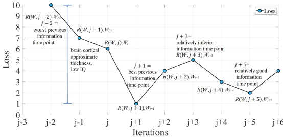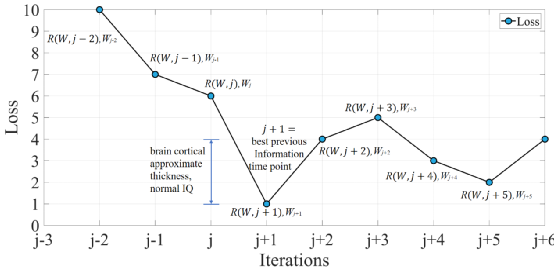 阿尔兹海默症将出现,海马体逐渐萎缩和变硬因为反向的湍流,结果被体现在图6,如同一个行星逐渐死亡形成黑洞。我们的猜想阿尔兹海默症的认知破坏是由搜索方向的反转导致,反向传播的负梯度被修正为正梯度,导致不能够收敛,转变方向的改变在图5-6体现 [30]。式(5)的