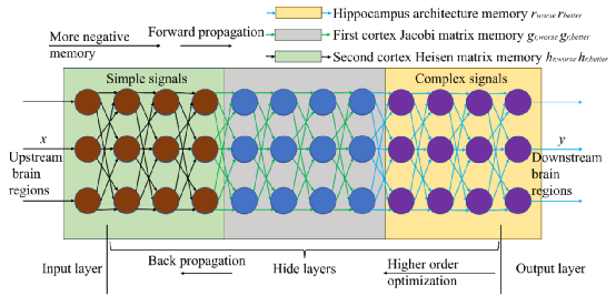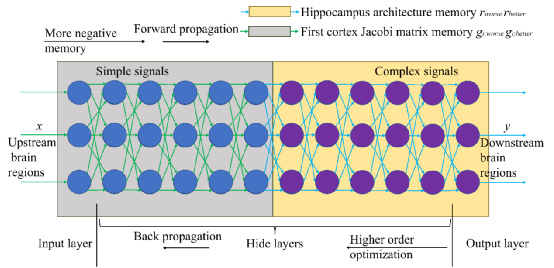 Backpropagation from the hippocampus to different cortexes, it requires higher-order optimization to process simple signals, indicates that the external part of the brain needs higher-order optimization, it is also possible to reduce the complexity of the calculation. Forward propagation from different cortexes to the hippocampus, complex signals require more fear memories to jump out of the local optimal solution, that is, more fear memories are needed inside the brain.