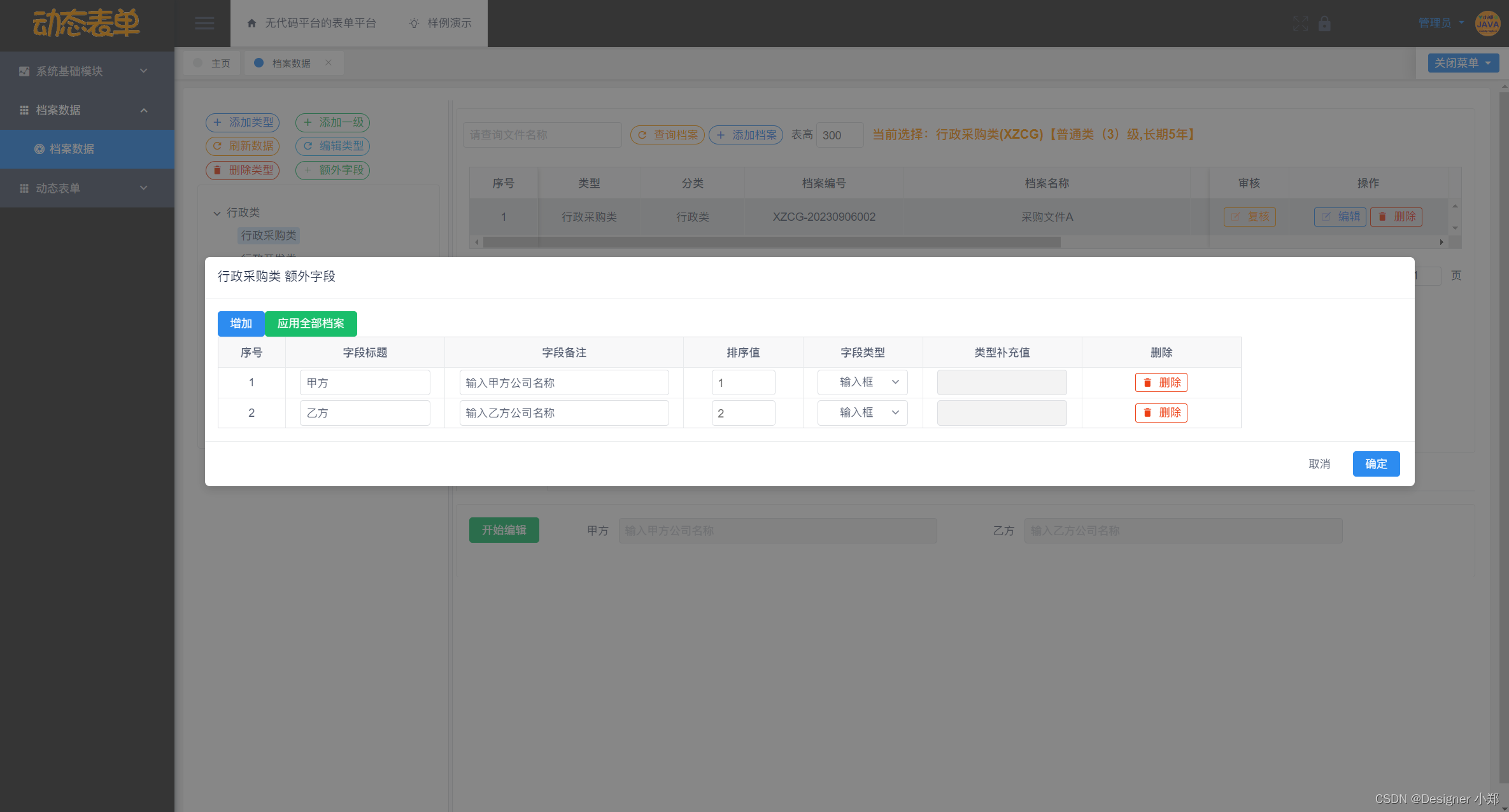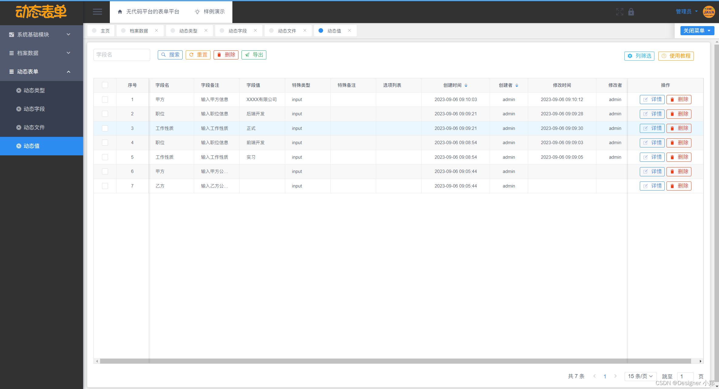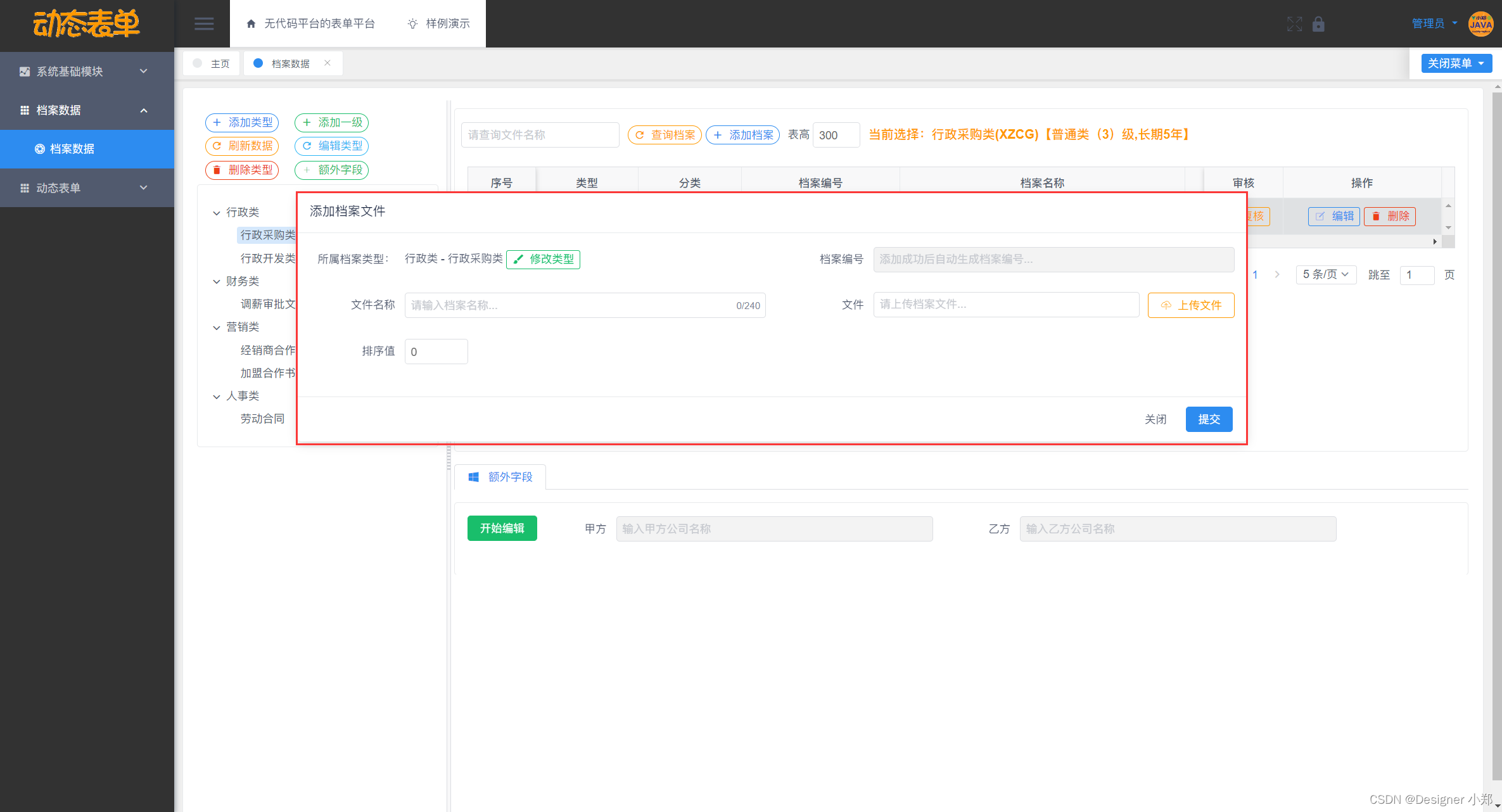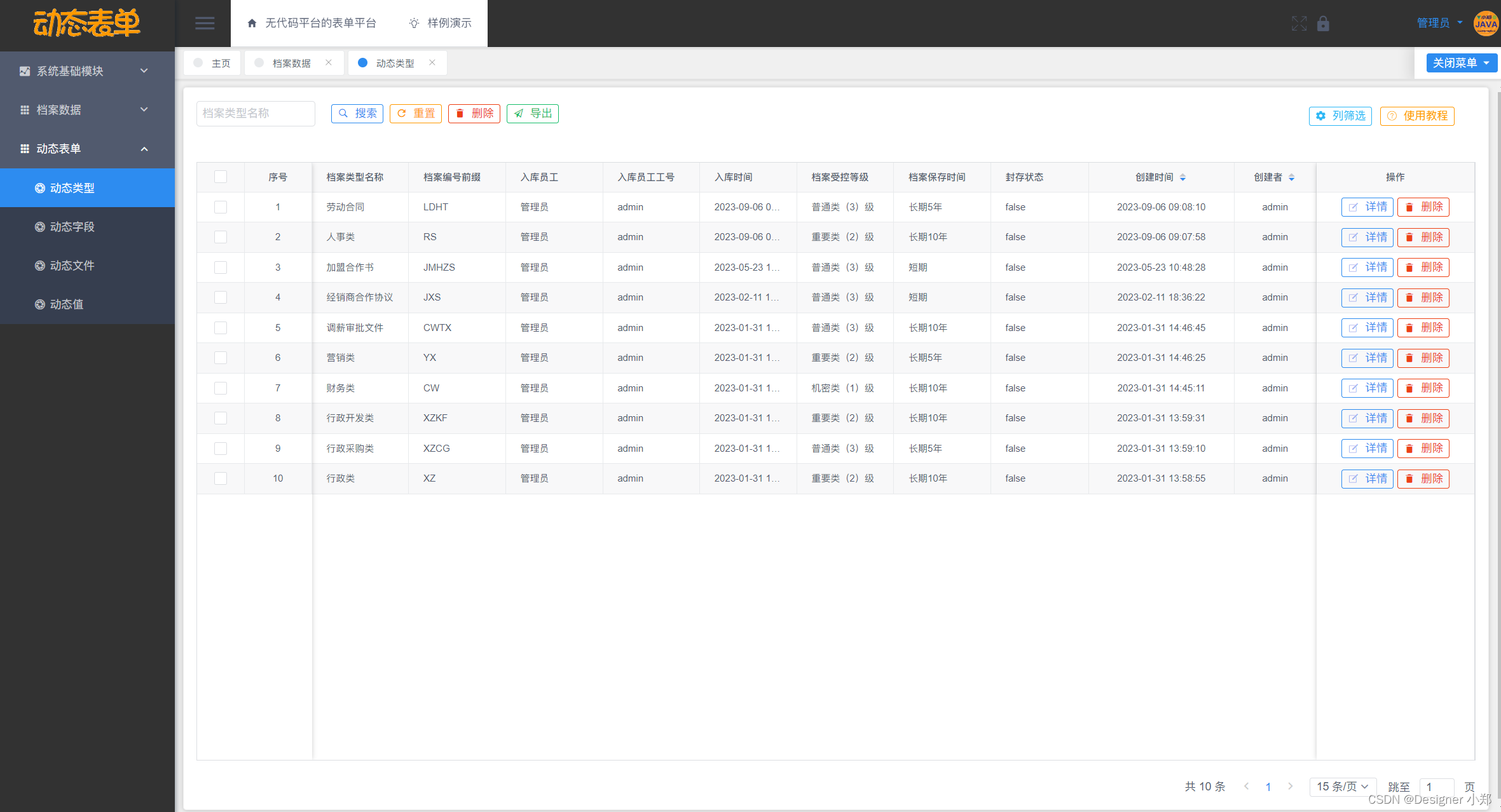 基于Vue+SpringBoot+MySQL的无代码平台的表单平台,包括了系统数据中心模块,用来存放管理系统通用的模块,另外分别设计了动态类型模块、动态文件模块、动态字段模块和动态值模块这四大模块,用于实现档案管理系统的核心表单逻辑。