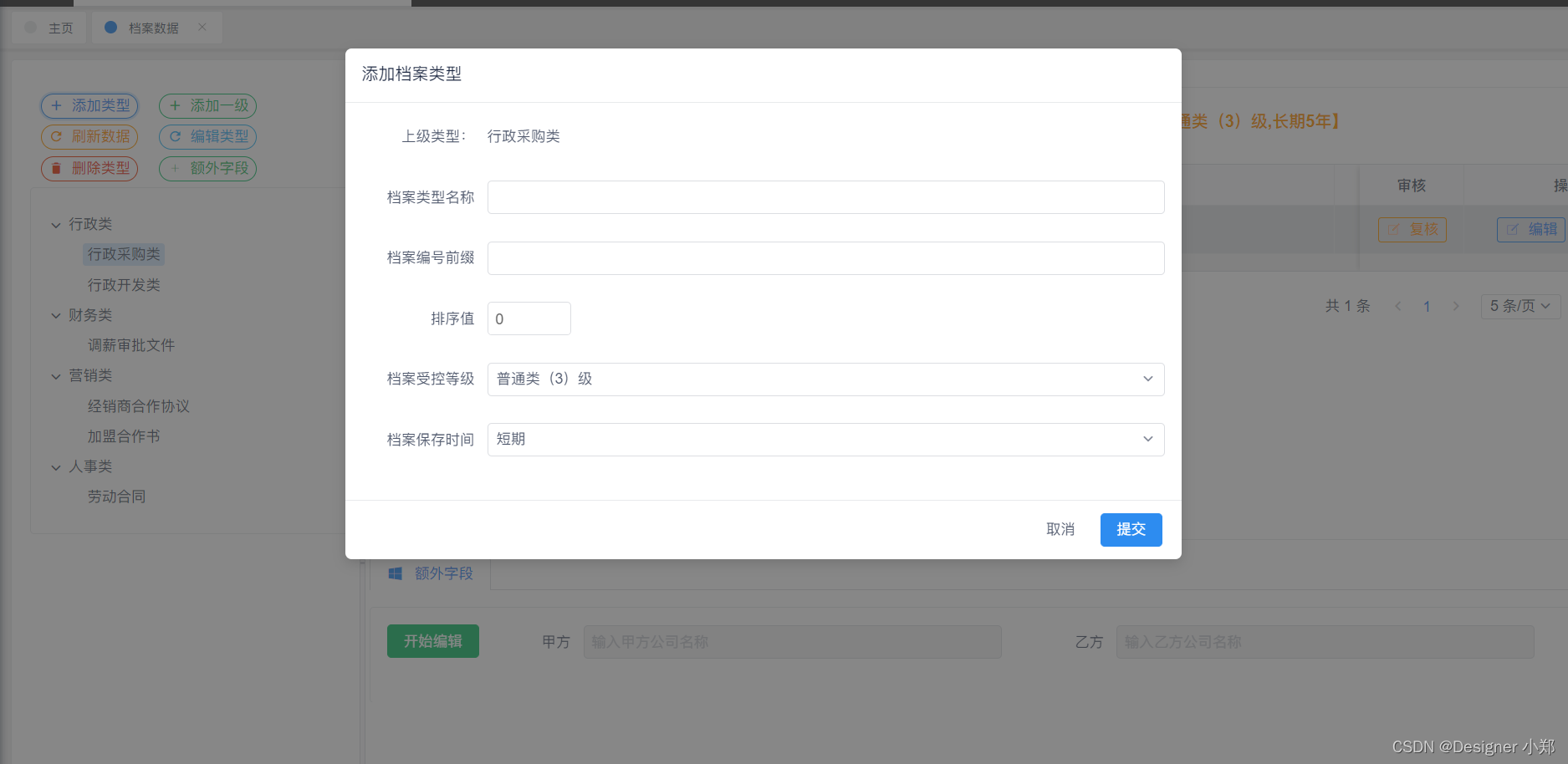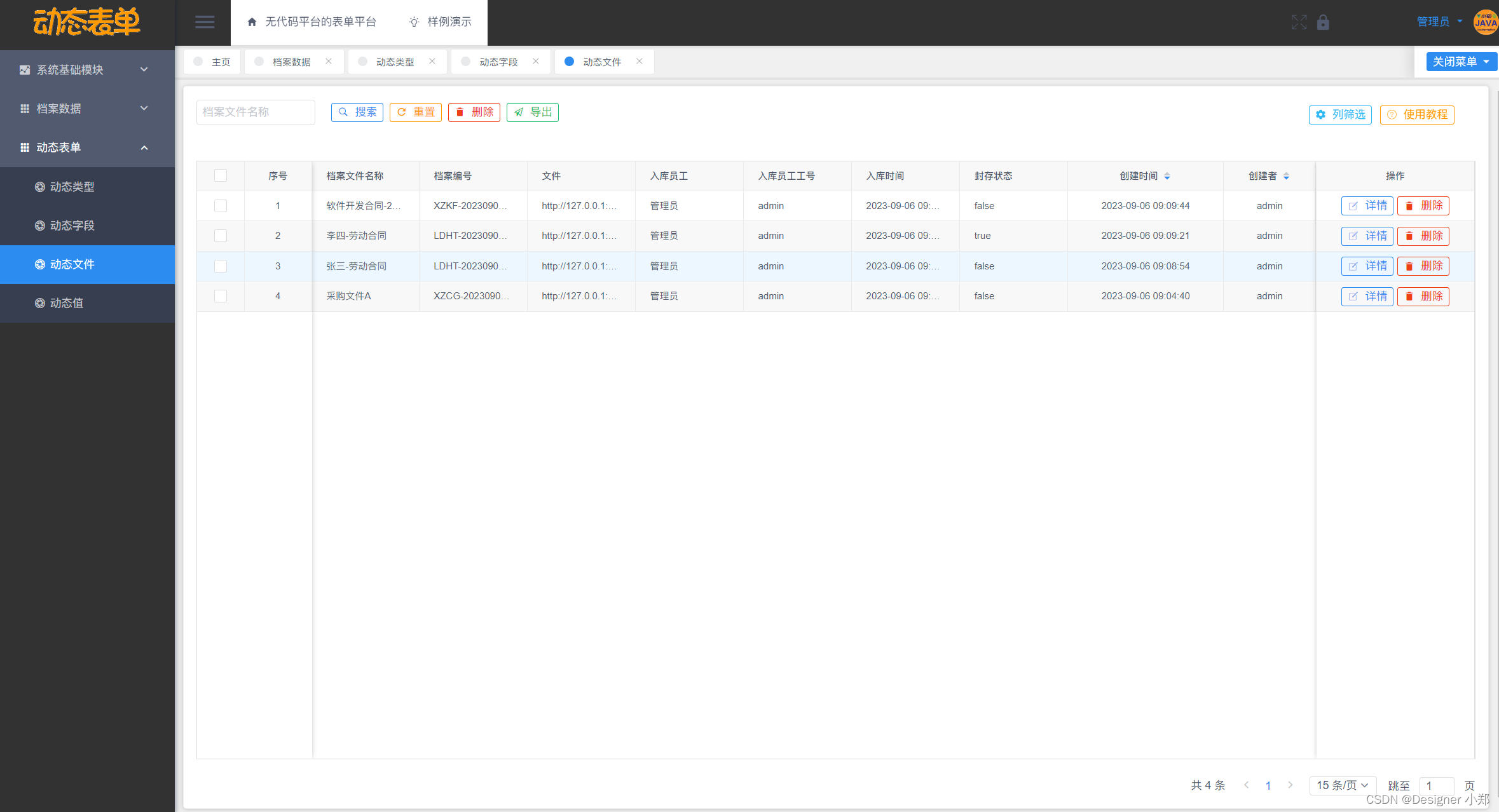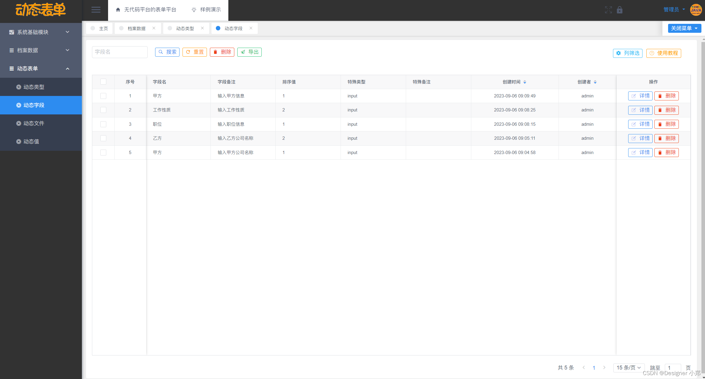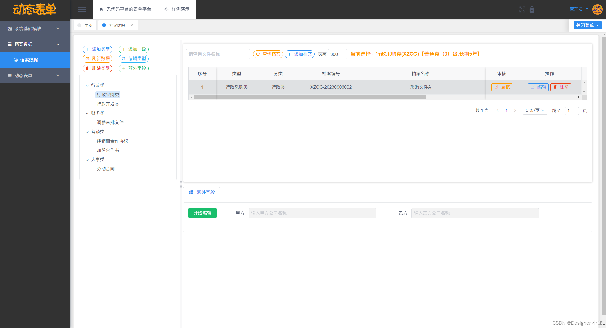 基于Vue+SpringBoot+MySQL的无代码平台的表单平台,包括了系统数据中心模块,用来存放管理系统通用的模块,另外分别设计了动态类型模块、动态文件模块、动态字段模块和动态值模块这四大模块,用于实现档案管理系统的核心表单逻辑。