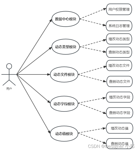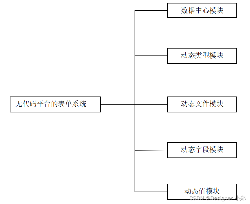 本文设计的无代码平台的表单系统的包括了系统数据中心模块,用来存放管理系统通用的模块,另外分别设计了动态类型模块、动态文件模块、动态字段模块和动态值模块这四大模块,用于实现档案管理系统的核心表单逻辑。