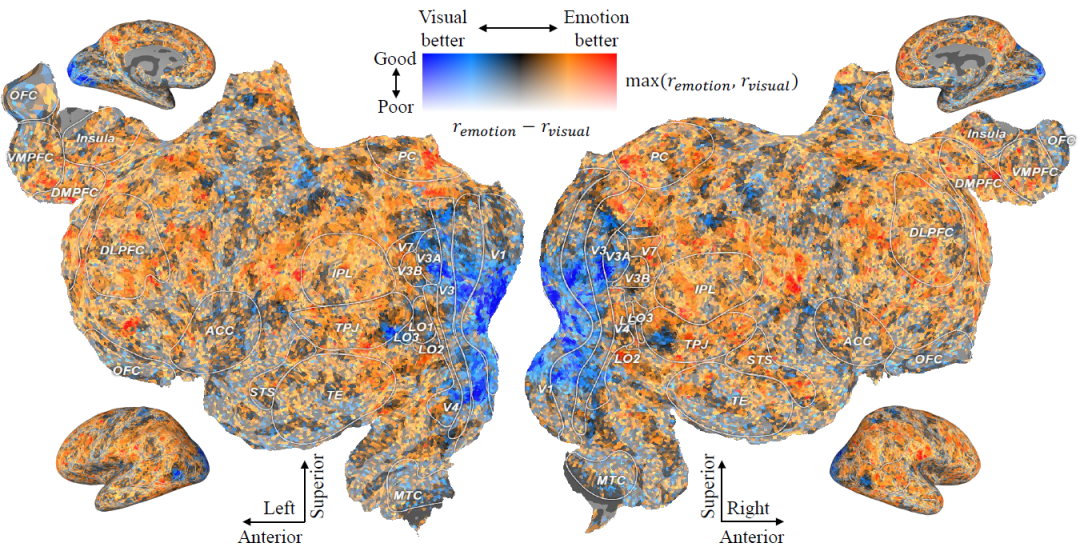 图2 情绪类别评分和视觉特征的预测准确度的差异在皮层上的投影。