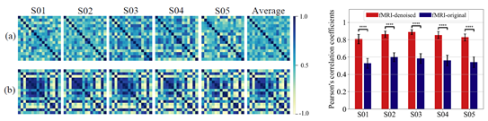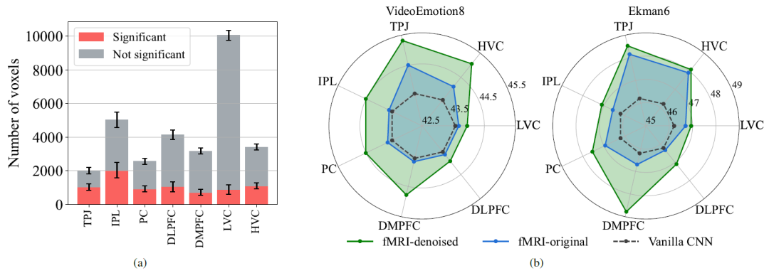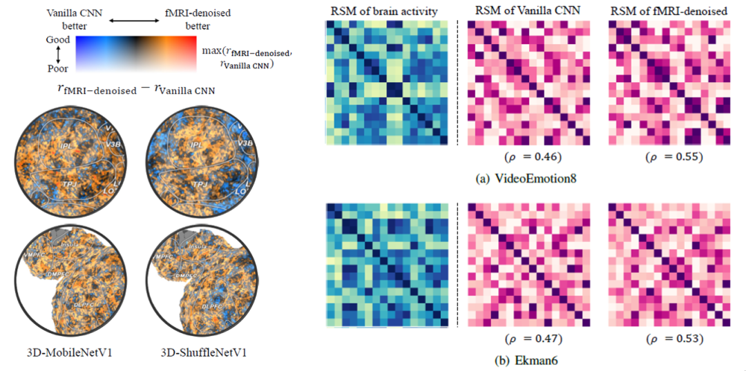 对于第一个难题,研究人员首先基于神经影像数据构建体素级编码模型,模型的输入特征为情绪类别评分和视觉特征两部分,输出为大脑的体素响应。考虑到实验需要获取大脑对情绪的表征而排除视觉信息的干扰,研究人员将视觉特征也一并用作编码模型的输入特征构建带状岭回归模型,模型的预测结果如图2所示。研究团队对每个被试根据体素预测的显著性水平(p<0.01,FDR-corrected)确定体素选择的阈值。而在深度学习模型的特征选择方面,由于缺乏用于特征选择的先验知识(即难以获得神经网络的层次表征和情绪感知的相关性),研究团队对神经网络的每一层特征进行加权从而得到最终的神经网络特征,其中权重是可学习的参数。 图3 被试差异性的可视化分析。左图:每个被试在使用线性模型降噪前后的表征相似性矩阵的可视化,(a)为原始脑信号的结果,(b)为线性模型输出替代原始脑信号的结果。右图:对左图所示的被试间差异性的定量分析。