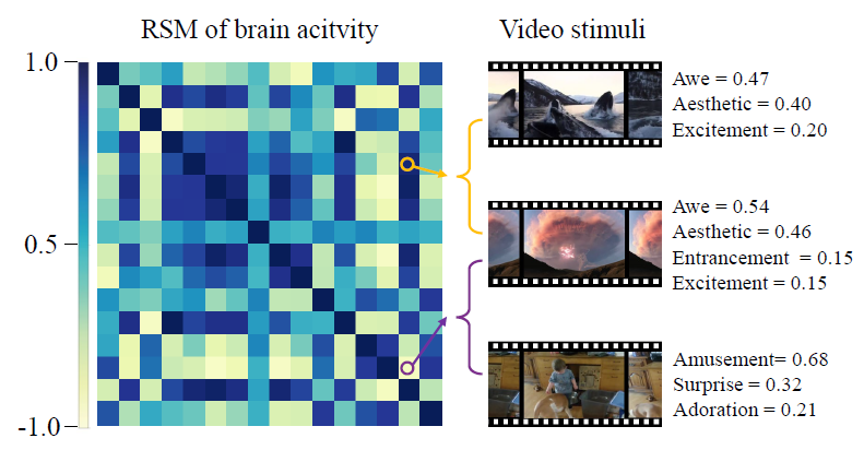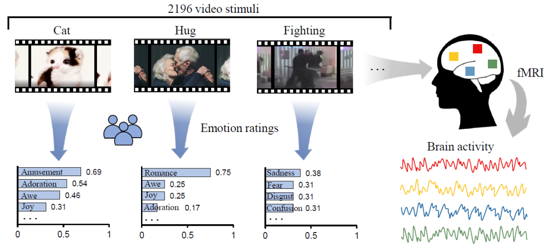为了实现上述“迁移”,研究人员利用人脑在自然视觉刺激下的神经影像数据(如图1所示)将深度学习模型和大脑的情绪表征进行对齐。这其中面临三个主要难题:其一是如何选择情绪相关的大脑响应和深度神经网络的特征用于后续研究;其二是如何处理被试之间情绪感知的差异性从而更高效地利用已有数据;其三是如何在具有高度异质性的深度学习模型的表征和大脑响应之间建立联系。