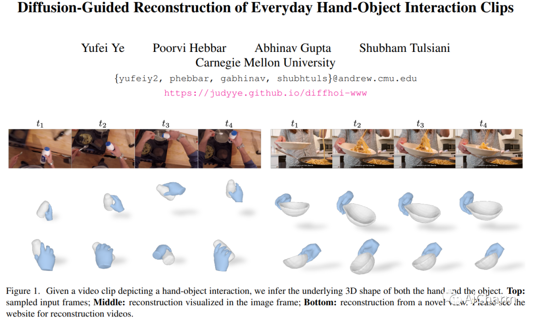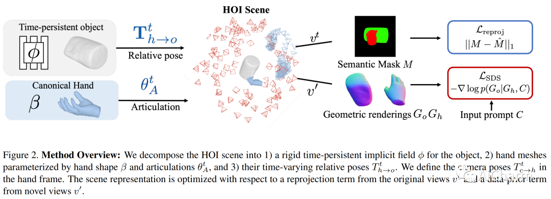 我们解决从短视频剪辑中重建手部物体交互的任务。给定输入视频,我们的方法将 3D 推理作为每个视频的优化,并恢复对象形状的神经 3D 表示以及随时间变化的运动和手部清晰度。虽然输入视频自然地提供了一些多视图线索来指导 3D 推理,但由于遮挡和有限的视点变化,这些线索本身是不够的。为了获得准确的 3D,我们使用通用数据驱动的先验来增强多视图信号以指导重建。具体来说,我们学习一个扩散网络来对以手部配置和类别标签为条件的对象(几何)渲染的条件分布进行建模,并利用它作为先验来指导重建场景的新颖视图渲染。我们对 6 个对象类别的以自我为中心的视频进行实证评估,并观察到相对于之前的单视图和多视图方法的显着改进。最后,我们展示了我们的系统重建 YouTube 中的任意剪辑的能力,显示第一人称和第三人称交互。