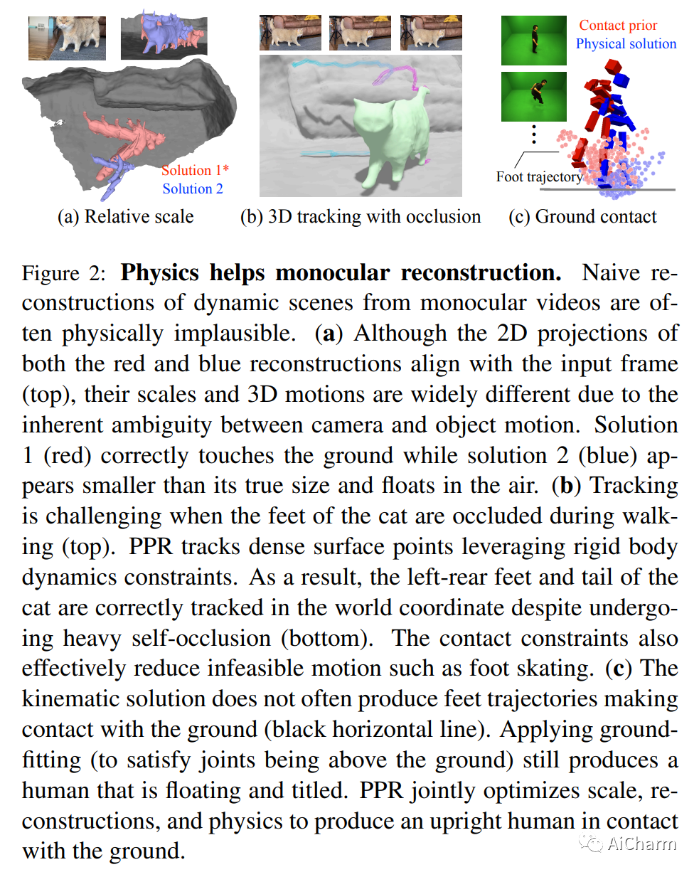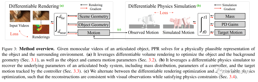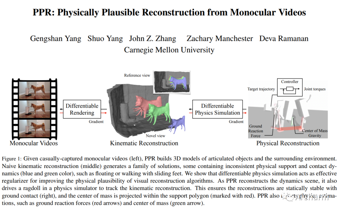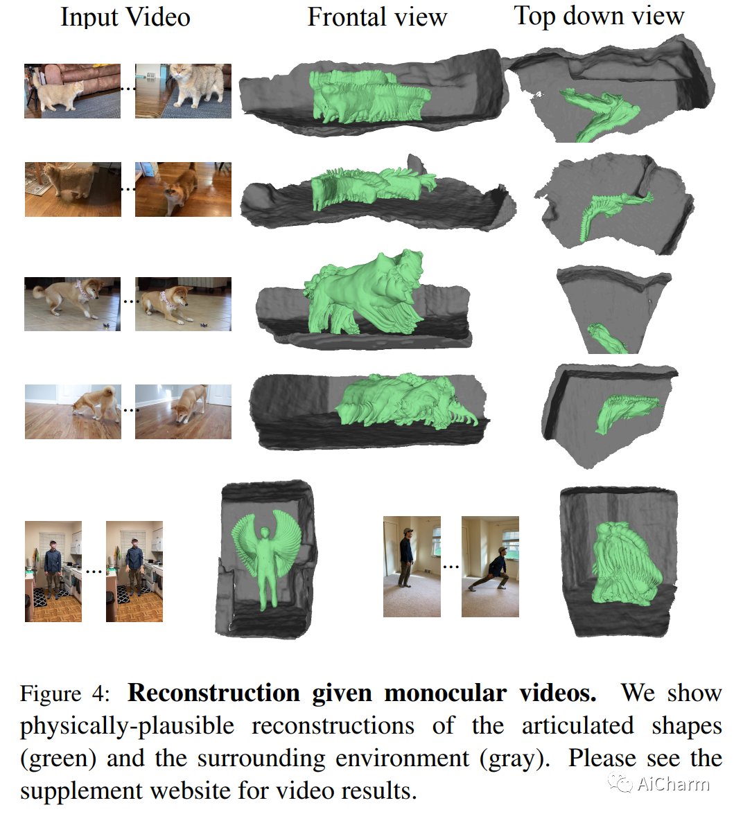 给定单目视频,我们构建铰接物体和环境的 3D 模型,其 3D 配置满足动力学和接触约束。我们的方法的核心是利用可微的物理模拟来帮助视觉重建。我们通过坐标下降将可微物理模拟与可微渲染结合起来,这不仅可以实现 3D 重建,还可以实现视频中物理系统参数的端到端优化。我们证明了对四足动物和人类的单眼视频进行物理信息重建的有效性。它减少了仅通过视觉线索难以解决的重建伪影(例如尺度模糊、不平衡姿势和脚交换),并产生更好的脚接触估计。
