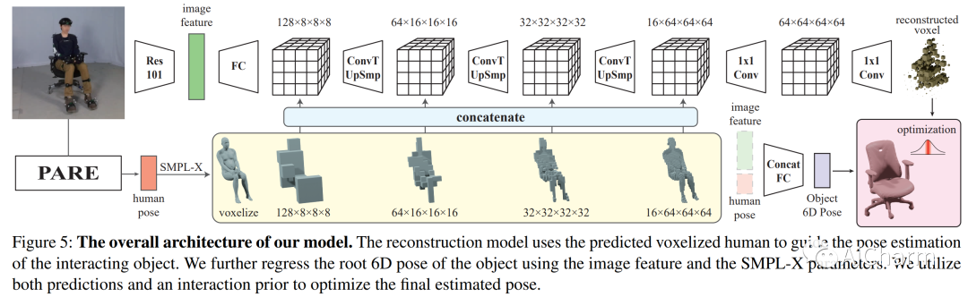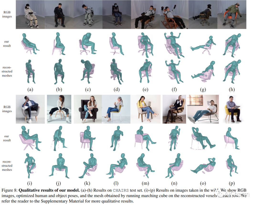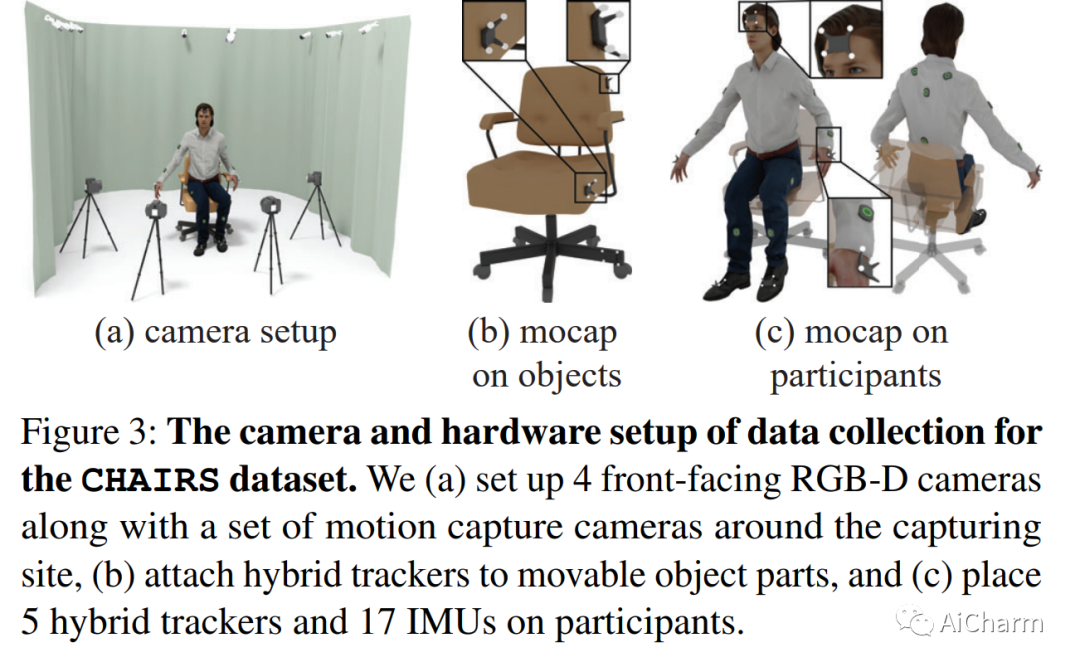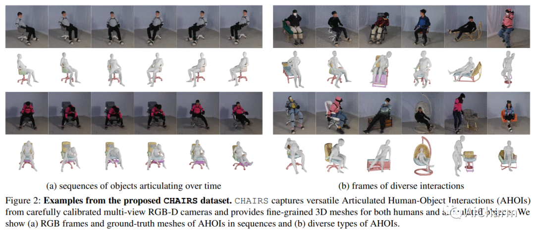3D HOI 的细粒度捕获可增强人类活动理解并促进下游视觉任务,包括动作识别、整体场景重建和人体运动合成。尽管其意义重大,但现有的研究大多假设人类仅使用少数身体部位与刚性物体进行交互,从而限制了其范围。在本文中,我们解决了 f-AHOI 的挑战性问题,其中整个人体与铰接物体相互作用,铰接物体的各个部分通过可移动关节连接。我们提出了 CHAIRS,一个大规模动作捕捉的 f-AHOI 数据集,由 46 名参与者和 81 个铰接式刚性可坐物体之间 16.2 小时的多功能交互组成。CHAIRS 在整个交互过程中提供人类和铰接物体的 3D 网格,以及逼真且物理上合理的全身交互。我们展示了 CHAIRS 与物体姿态估计的价值。通过学习 HOI 中的几何关系,我们设计了第一个模型,利用人体姿势估计来处理全身交互过程中铰接物体姿势和形状的估计。给定图像和估计的人体姿势,我们的模型首先重建对象的姿势和形状,然后根据学习到的交互先验优化重建。在两种评估设置下(例如,无论是否了解物体的几何形状/结构),我们的模型都显着优于基线。我们希望 CHAIRS 能够促进社区实现更细粒度的交互理解。我们将公开数据/代码。