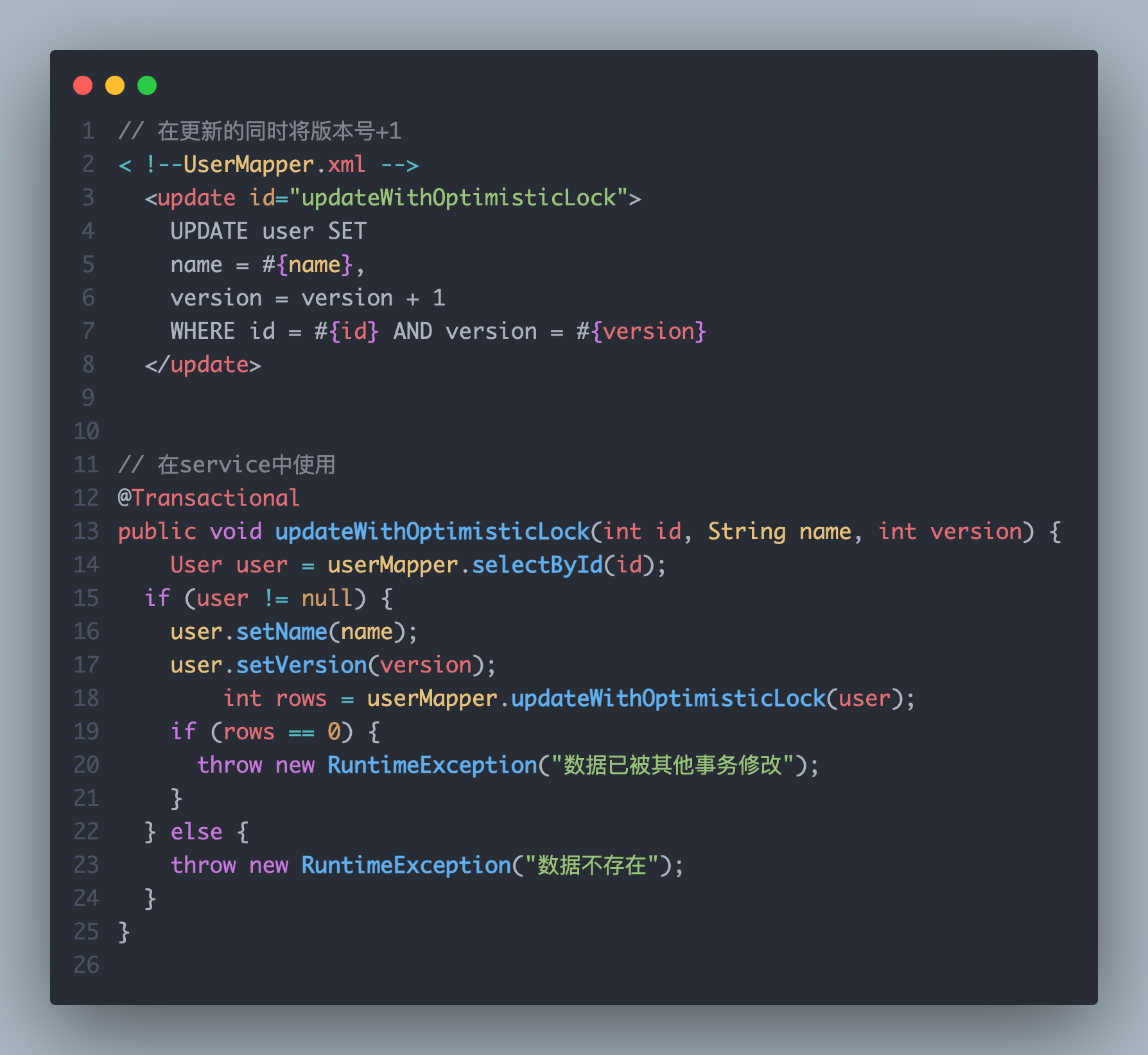 其实就是在数据修改的时候加上一个版本号,我们在修改的时候加上版本号作为去修改的条件。这一点shigen是使用elasticSearch的时候也遇到过。