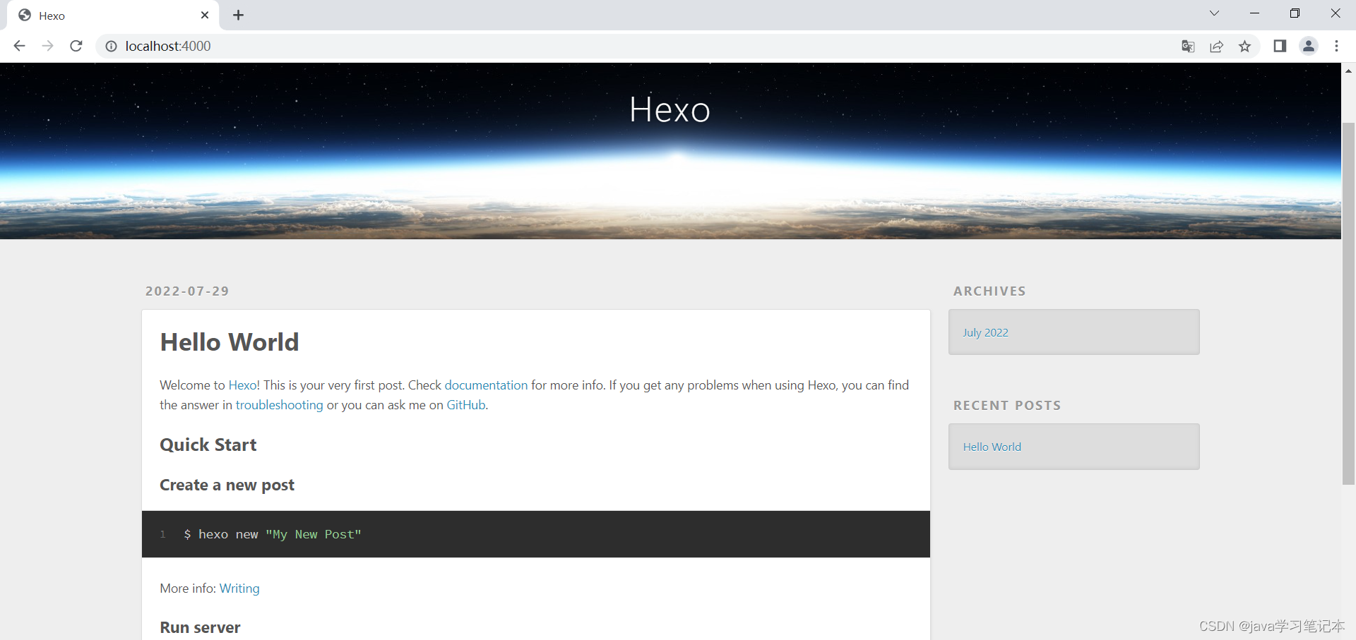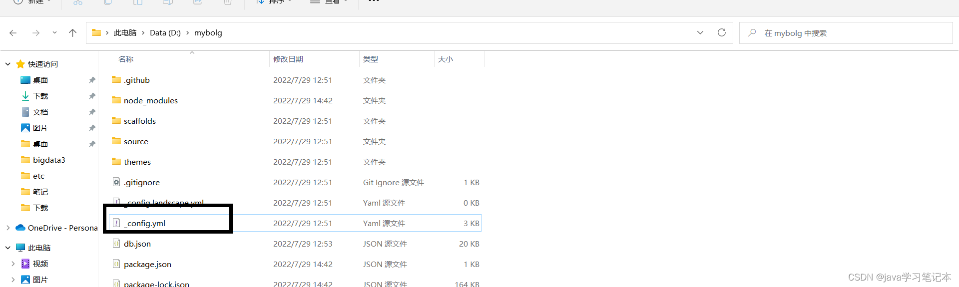 新建完成后,指定文件夹目录下有: node_modules: 依赖包 public:存放生成的页面 scaffolds:生成文章的一些模板 source:用来存放你的文章 themes:主题 ** _config.yml: 博客的配置文件**