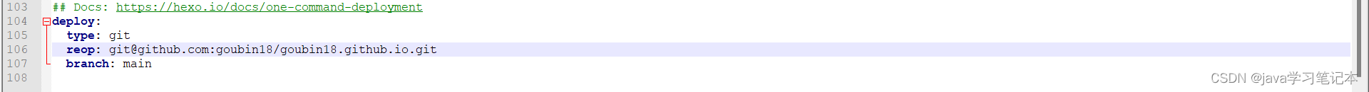 这一步,我们就可以将hexo和GitHub关联起来,也就是将hexo生成的文章部署到GitHub上,打开站点配置文件 _config.yml,翻到最后,修改为 YourgithubName就是你的GitHub账户