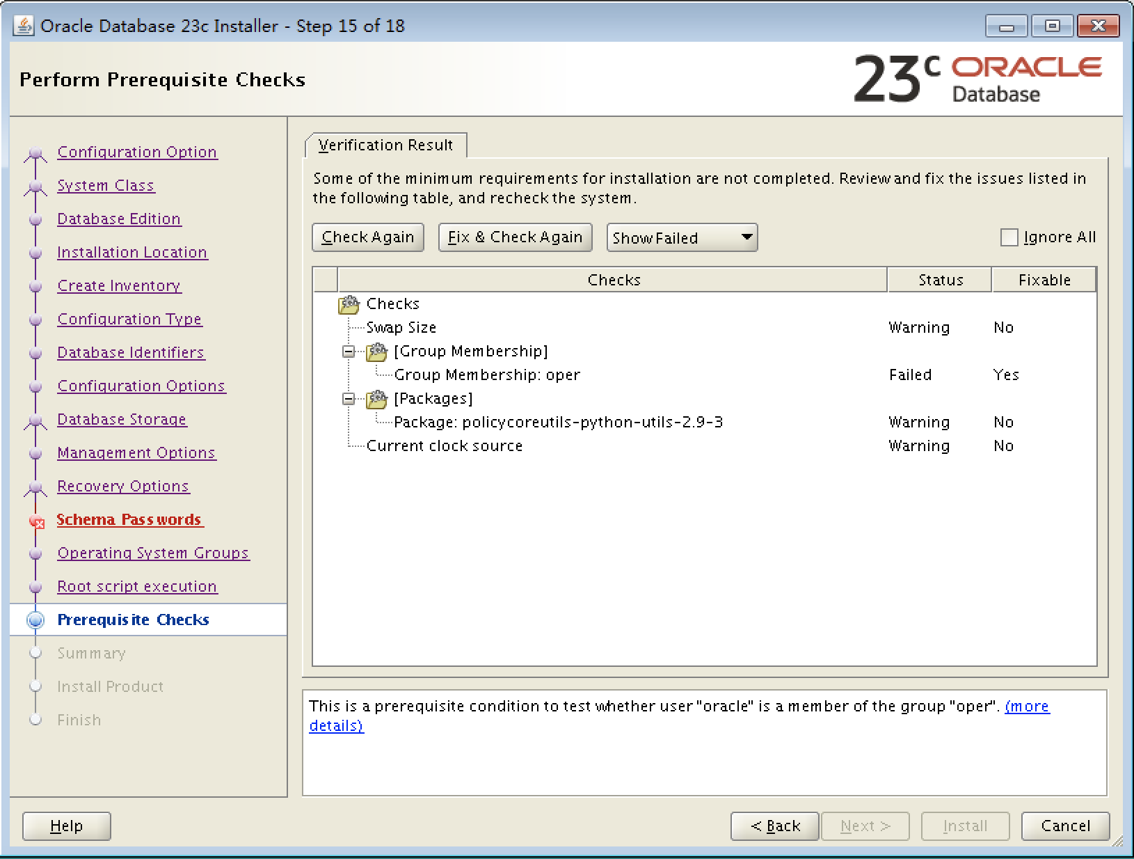 另外注意,在预检查的部分,发现默认除了oinstall和dba组,还有oper组,可以执行脚本修复: