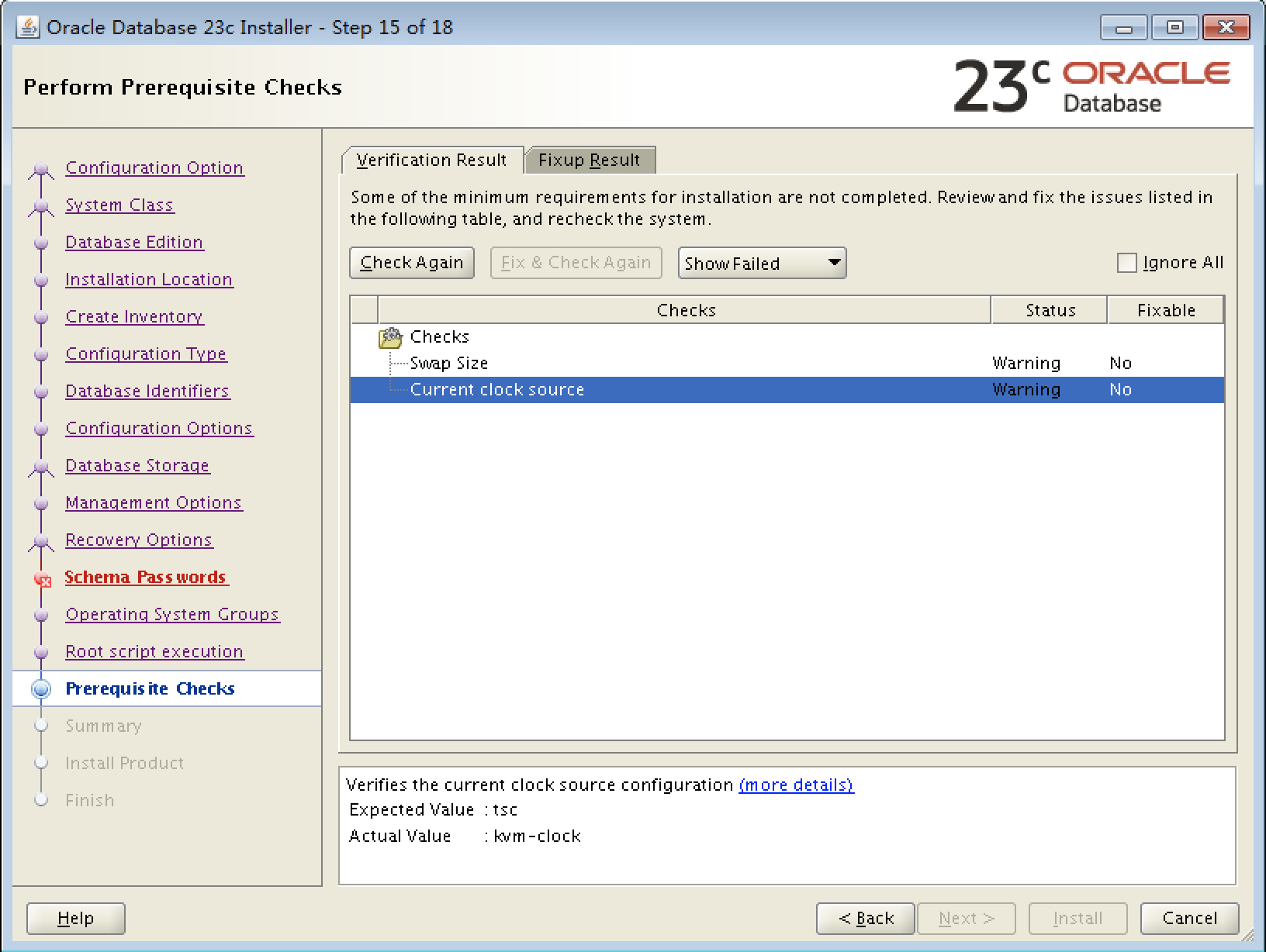 修复之后,就只剩下swap和kvm-clock两项不符合要求了,这个是我测试环境受限,可以忽略: