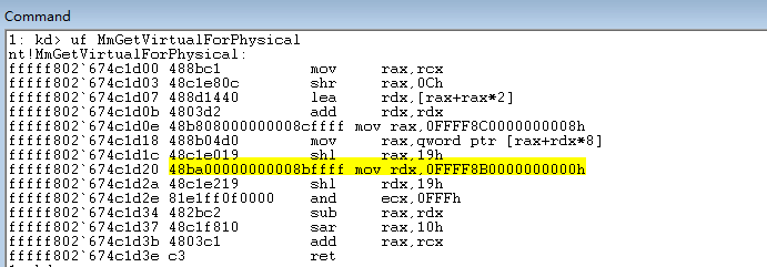 pfn 405f ---DA--UW-V not valid由于PTE是动态变化的,找到该地址的关键就在于通过MmGetSystemRoutineAddress函数动态得到MmGetVirtualForPhysical的内存地址,然后向下扫描特征寻找mov rdx,0FFFF8B0000000000h并将内部的地址提取出来。