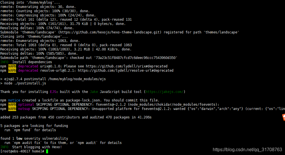 cd /home,然后创建你的第一个站点,比如叫做myblog输入命令hexo init myblog(耐心等待2分钟)