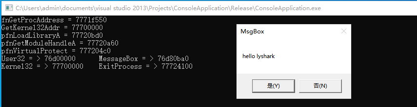 int nRet = pfnMessageBoxA(NULL, "hello lyshark", "MsgBox", MB_YESNO);