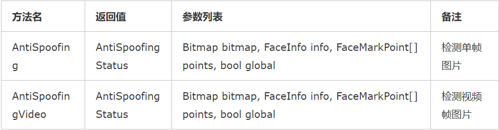 - AntiSpoofing 的返回值 可能为 AntiSpoofingStatus.Real、AntiSpoofingStatus.Spoof 或 AntiSpoofingStatus.Fuzzy。