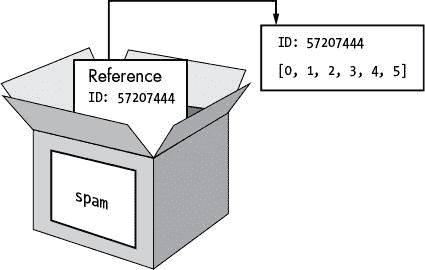 图 9-1:spam = [0, 1, 2, 3, 4, 5]存储一个列表的引用,而不是实际的列表。