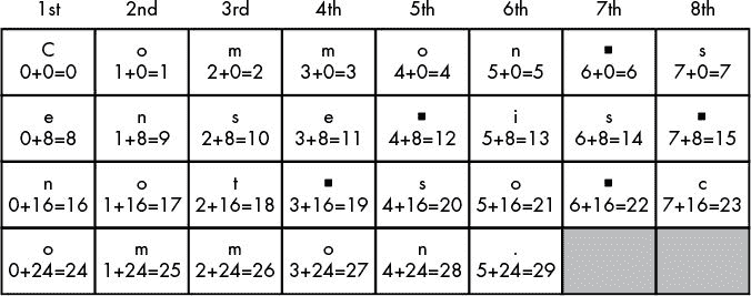 以真正随机的方式选择加密密钥对于密码的安全性是必要的,但是对于其他用途,比如这个代码测试,伪随机数就可以了。我们将使用伪随机数为我们的测试程序生成测试字符串。你可以通过使用random.SystemRandom().randint()函数用 Python 生成真正的随机数,你可以在/www.nostarch.com/crackingcodes了解更多。