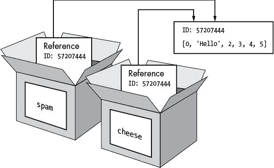 [0, 'Hello!', 2, 3, 4, 5]您可能会觉得这段代码很奇怪。代码只改变了cheese列表,但是cheese和spam列表都改变了。